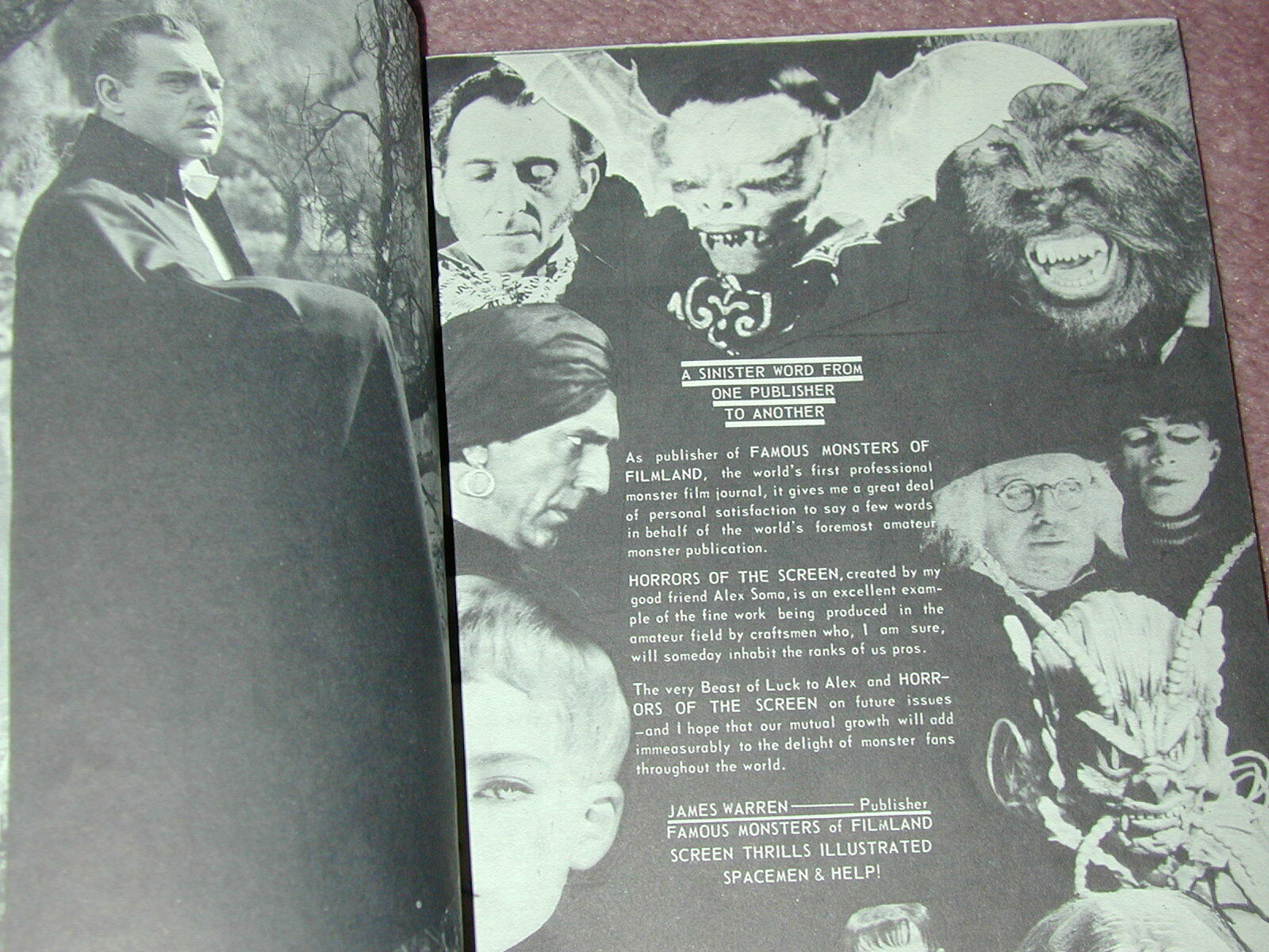 * Multiple auction winning items can be combined and shipped together to save on total shipping. Combined shipping will be quoted after auctions end. This auction is for Horrors of the Screen fanzine # 2 There is a nice letter printed the beginning by Jim Warren, publisher of Famous Monsters (see photo). Also, this fanzine was advertised for sale in the early days of FM. This item is 100% complete; There is nothing cut out or missing. If you have a question about the item in this auction, send me an email and I'll try to answer your question. I may not be able to respond immediately, but certainly before the auction ends. Do not leave your questions for the last few hours, as I may not see them in time. --------------------------------------- SHIPPING: Buyer in USA for shipping this item: * $7.95 for Priority mail, shipped with cardboard backing. I pack securely. Any request for specific packaging will require an additional cost. OUTSIDE USA buyer pays air-mail shipping. Cost based on weight of package and your location outside USA. Typical rates are shown for this item below. Canada $14.25