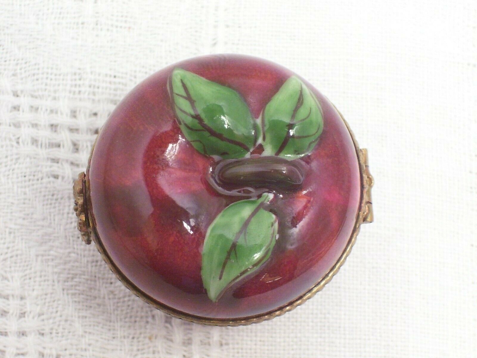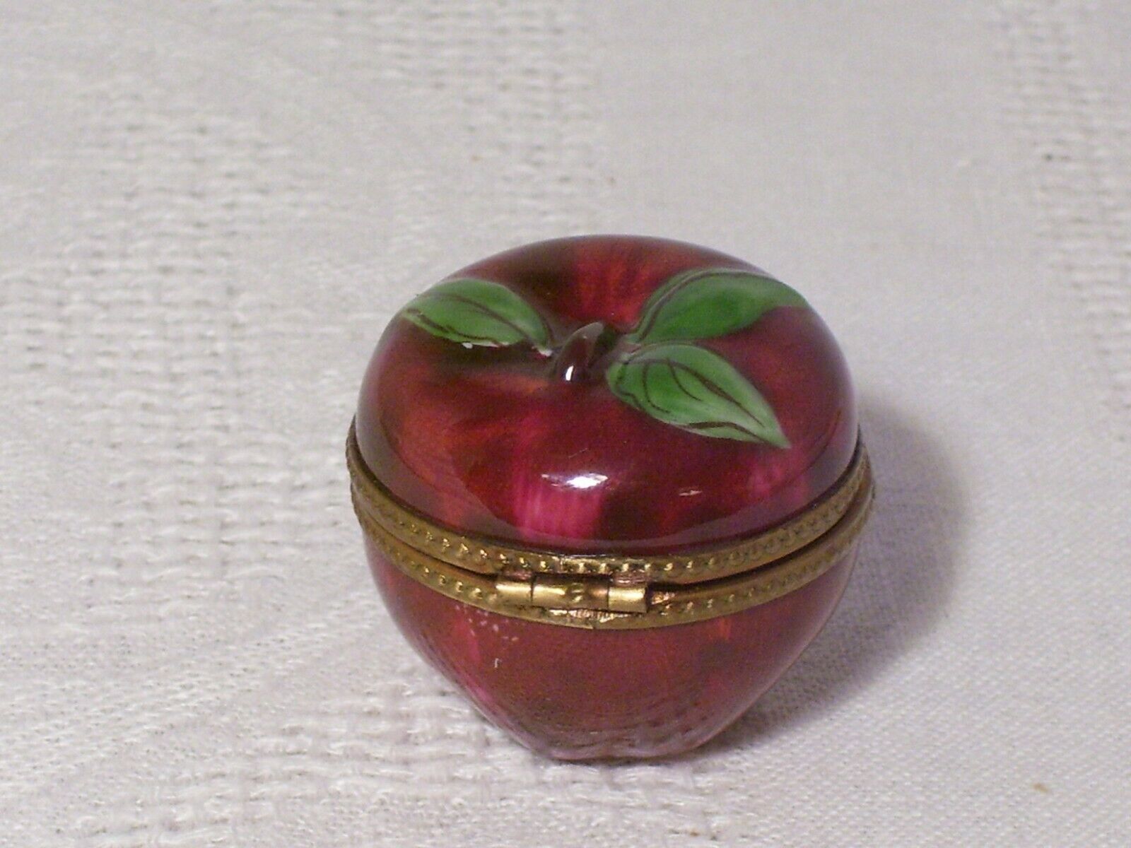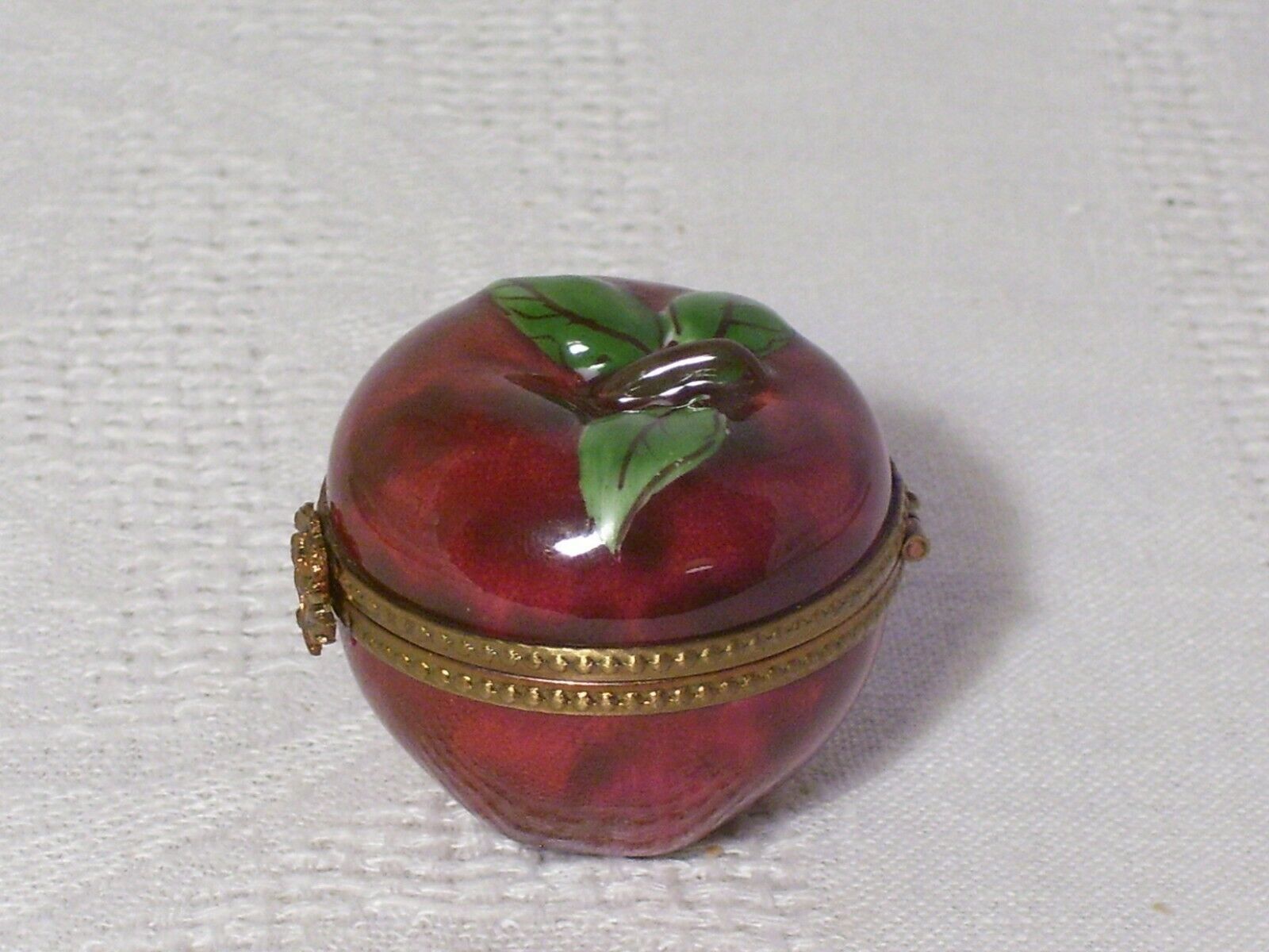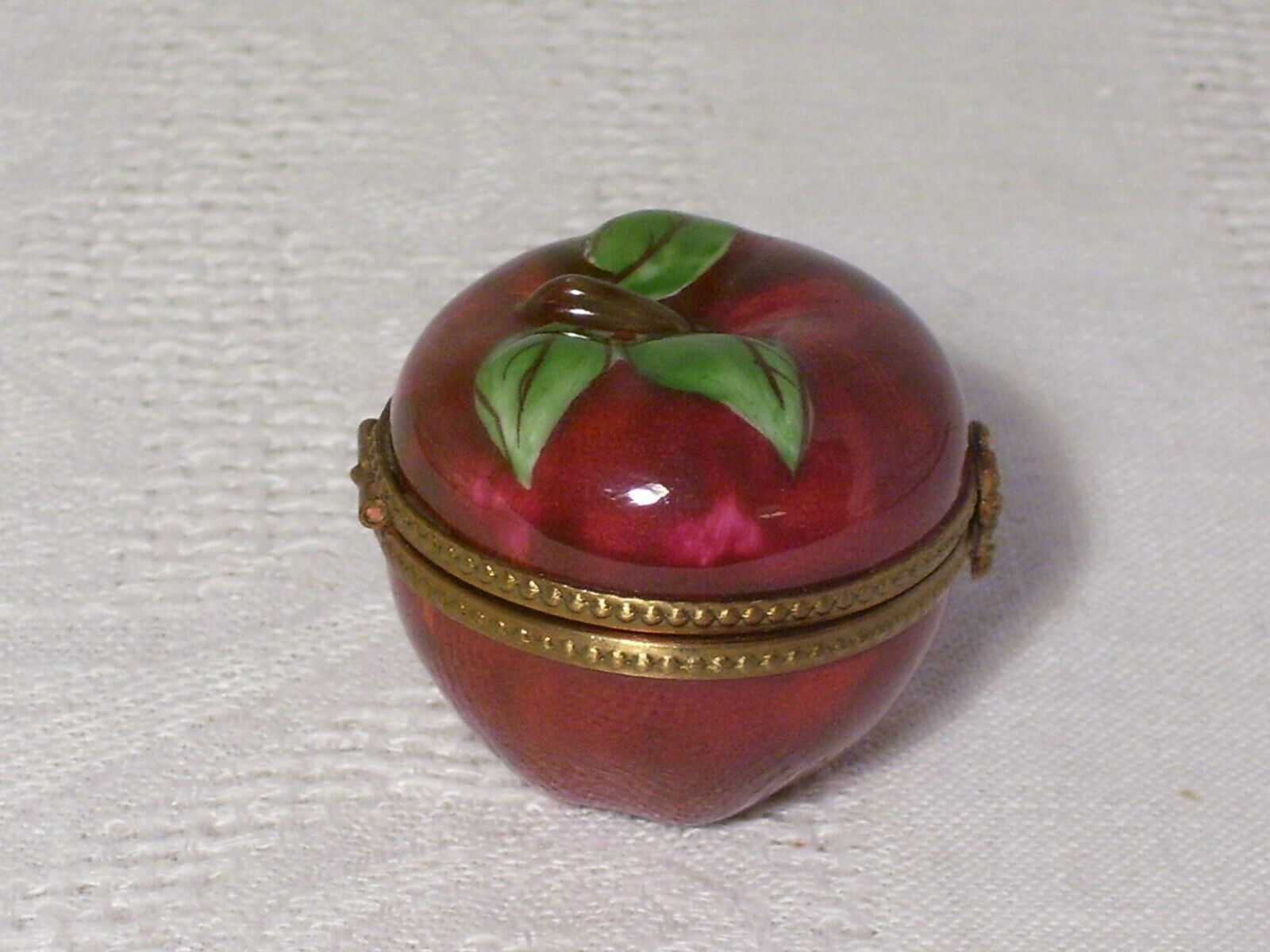 FOR YOUR CONSIDERATION... LIMOGES~RED APPLE~ PEINT MAIN TRINKET BOX~HAND PAINTED~HINGED LID~FLOWER CLOSURE. measures: approx 1 1/2" tall...signed inside the lid...beaded gold tone band with flower closure Condition is "Used".....no chips, no cracks Shipped with USPS First Class. ~ THANKS FOR LOOKING AND GOOD LUCK BIDDING ~ Please ask all questions before bidding. INVOICE. Buyer may wait to receive an invoice at the close of the auction.Payment is expected within 48 hrs. of the end of auction. REFUND.Returns accepted: 30 day return policy,if not as described. Purchase price refunded, postage is non-refundable. SHIPPING..All items are packaged with care. Shipping is next business day following my notification of your payment. Please be sure you have a confirmed mailing address. International bidders must request a shipping quote. You'll be notified when your item is shipped. PLEASE NOTE: There are some states, but not all, where eBay will be collecting sales tax on applicable transactions. You can learn more at eBay Customer Service about Taxes and Import fees on International purchases.
