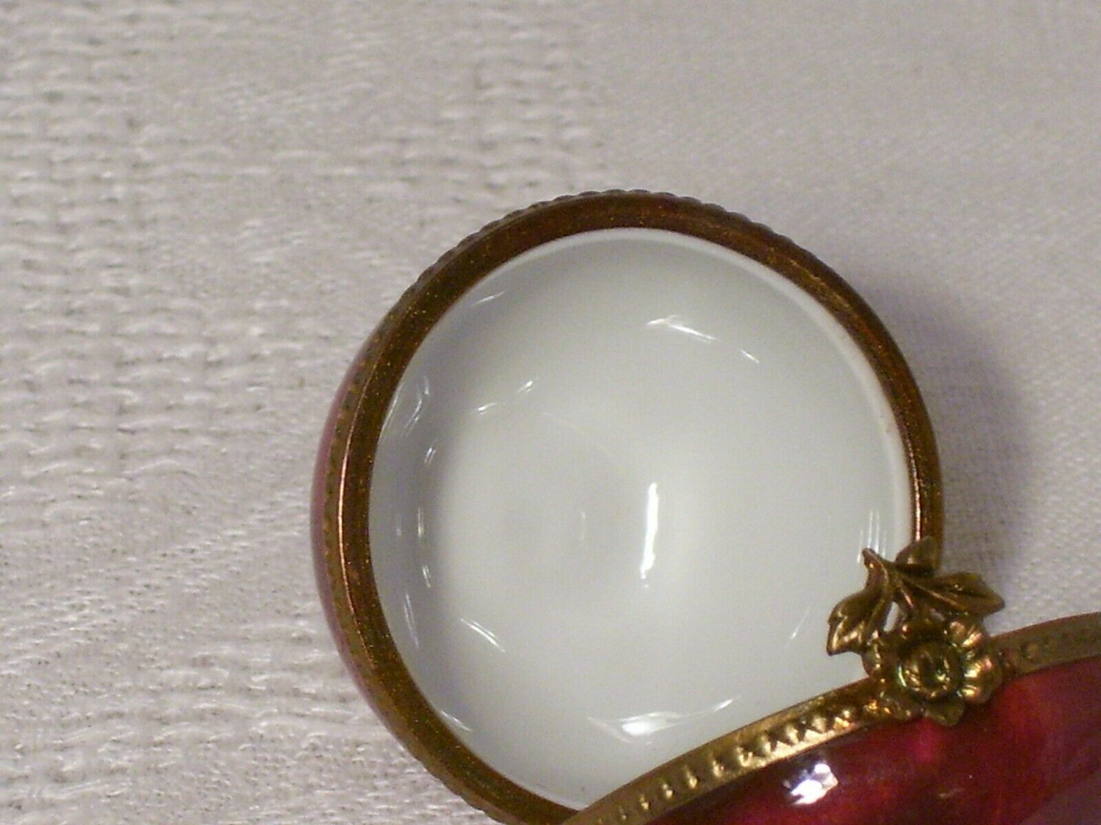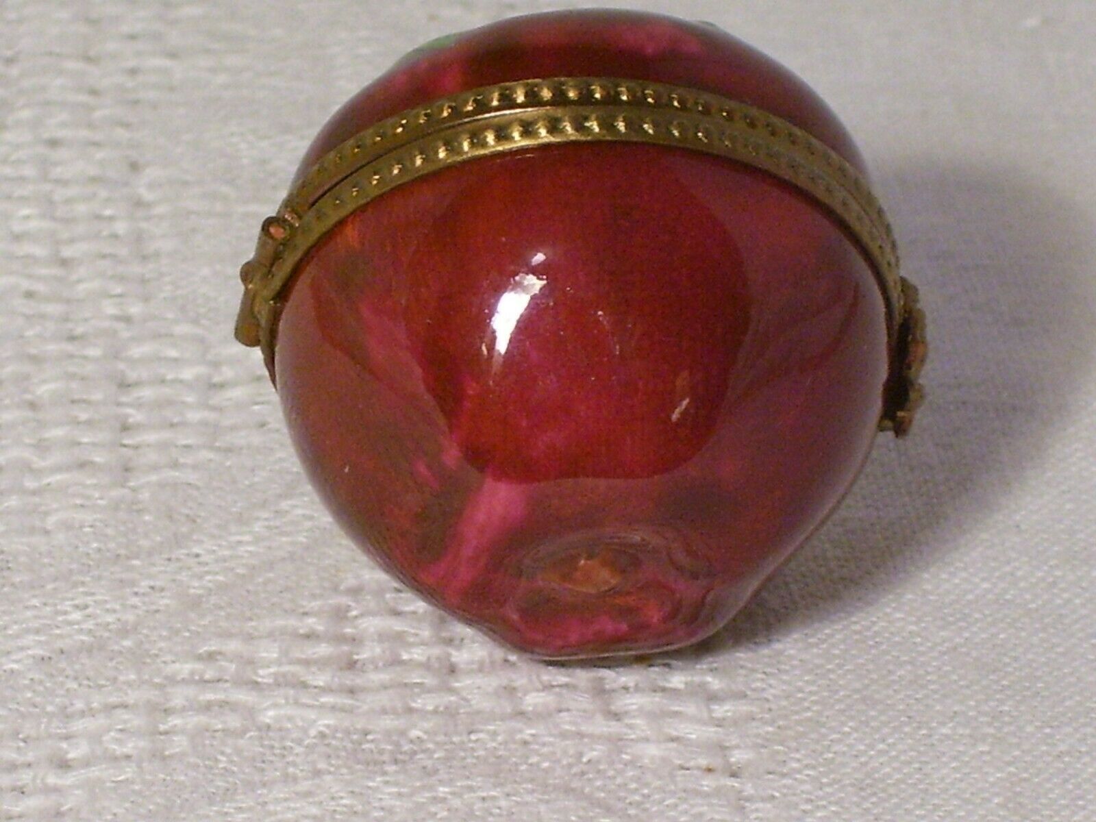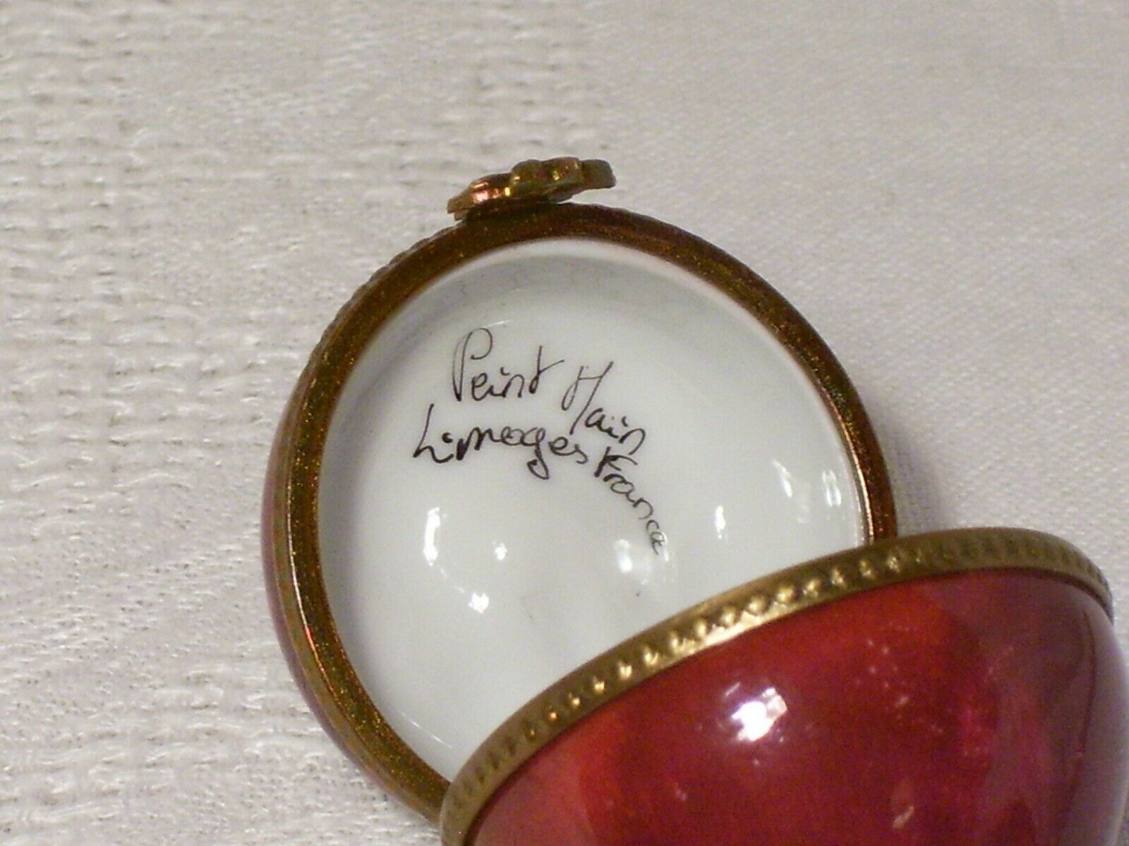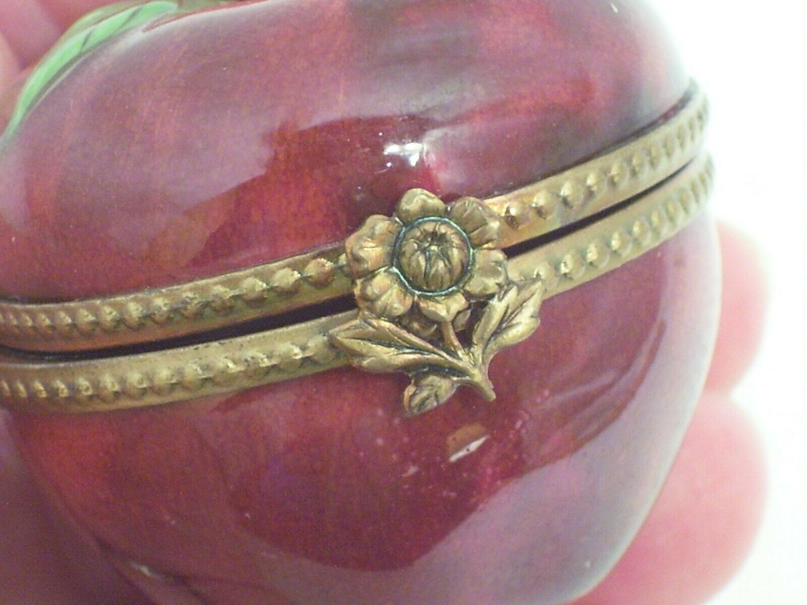 FOR YOUR CONSIDERATION... LIMOGES~RED APPLE~ PEINT MAIN TRINKET BOX~HAND PAINTED~HINGED LID~FLOWER CLOSURE. measures: approx 1 1/2" tall...signed inside the lid...beaded gold tone band with flower closure Condition is "Used".....no chips, no cracks Shipped with USPS First Class. ~ THANKS FOR LOOKING AND GOOD LUCK BIDDING ~ Please ask all questions before bidding. INVOICE. Buyer may wait to receive an invoice at the close of the auction.Payment is expected within 48 hrs. of the end of auction. REFUND.Returns accepted: 30 day return policy,if not as described. Purchase price refunded, postage is non-refundable. SHIPPING..All items are packaged with care. Shipping is next business day following my notification of your payment. Please be sure you have a confirmed mailing address. International bidders must request a shipping quote. You'll be notified when your item is shipped. PLEASE NOTE: There are some states, but not all, where eBay will be collecting sales tax on applicable transactions. You can learn more at eBay Customer Service about Taxes and Import fees on International purchases.