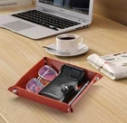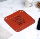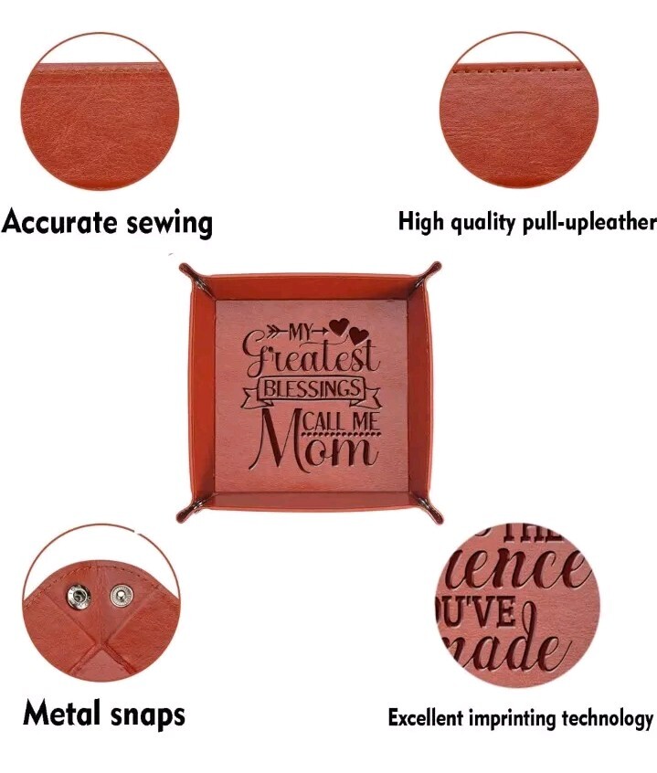 ***First 2 pictures are the actual product you will receive. The other pictures are stock photos for reference only.*** This leather key valet tray is the perfect gift for mom. Its square shape and brown leather make it a versatile addition to any desk or jewelry collection. The tray is made of high-quality leather and features a lining of leather. It is suitable for storing various types of jewelry such as necklaces, bracelets, rings, and earrings.
